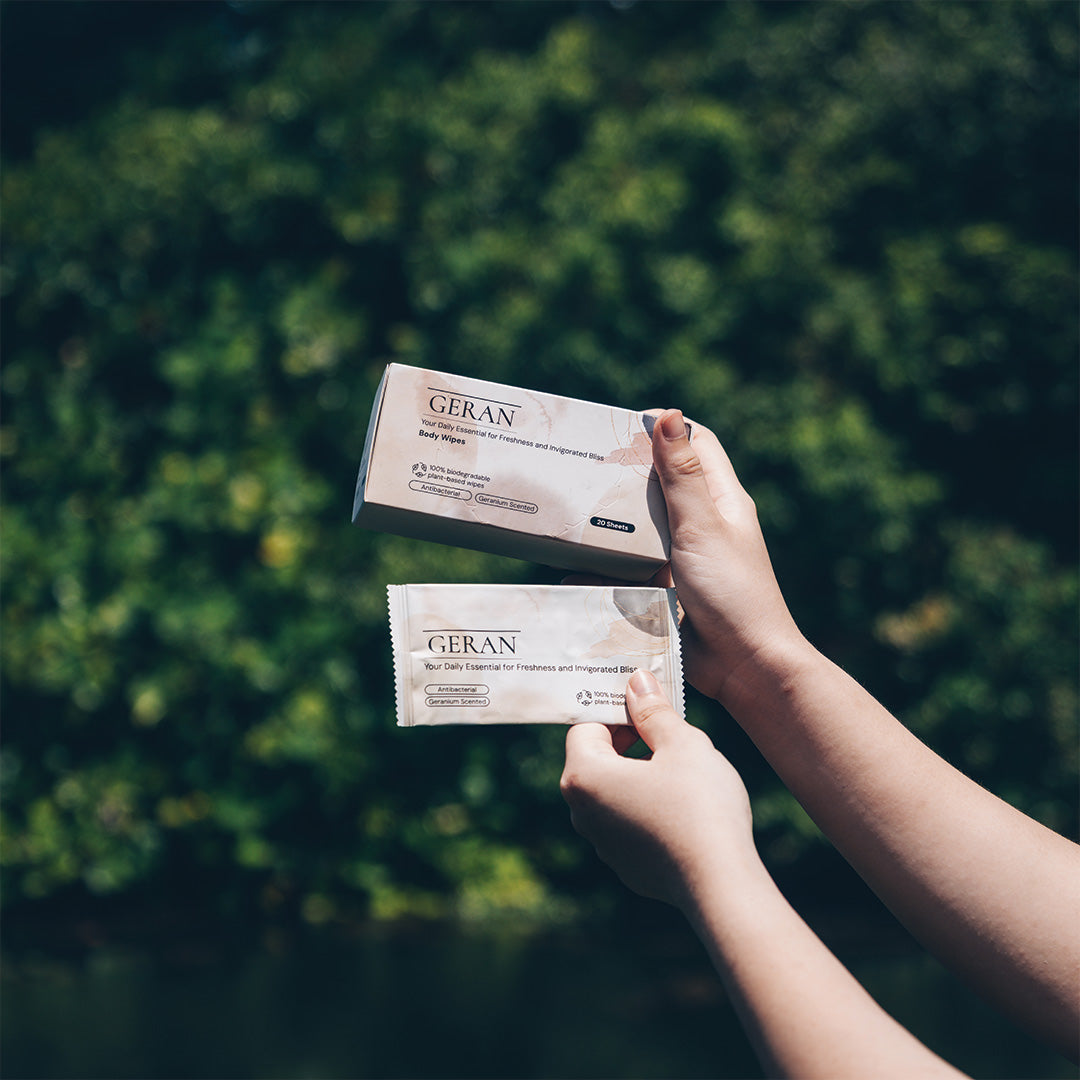 With 20 high-quality wipes per box, Geran Wipes is ideal for a quick refresh post-work out, during long commutes, or even before a night out. Out for a run? Just slip one Geran Wipe in your pocket and you are all good to go.